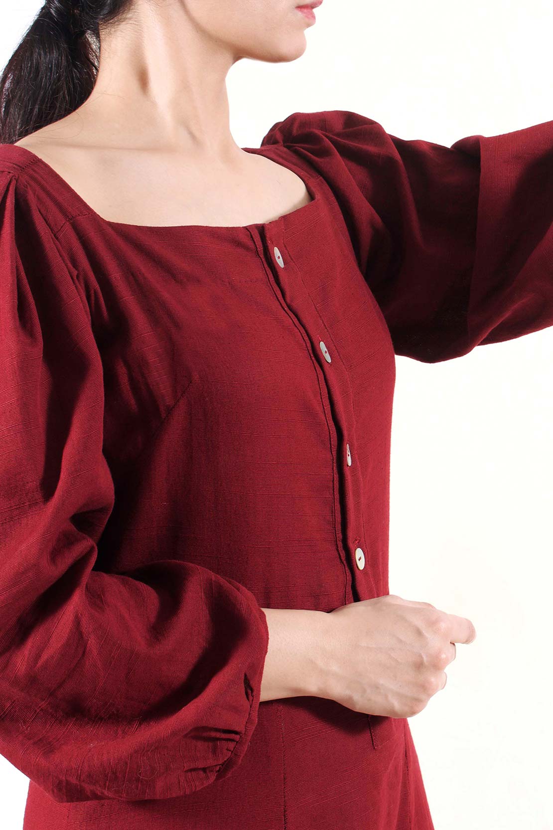 Maxi dress with front button and puffed sleeves. A playful choice for everyday wear.