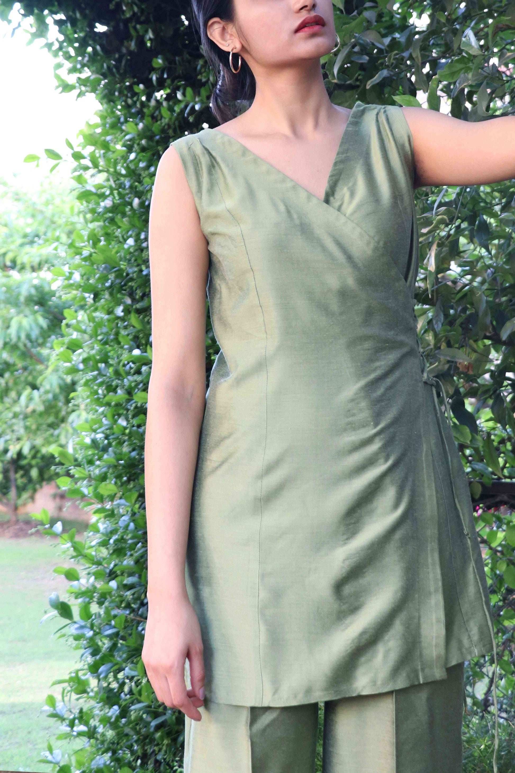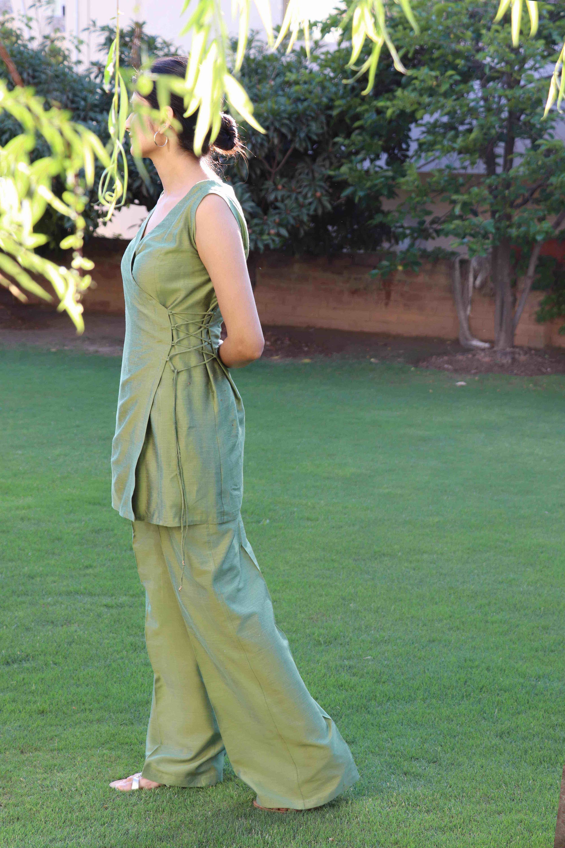 A flattering overlapping top flowing and flattering wide leg trousers for sheer and effortless look.